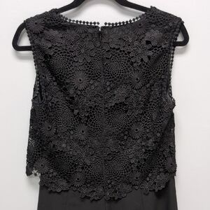 This black sleeveless midi dress features a delicate lace overlay that adds a touch of elegance to its A-line silhouette. The crew neck design and tiered effect create a sophisticated look, perfect for cocktail events or a night out.