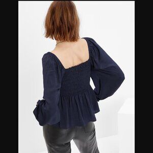 Classic yet sexy navy blue GAP blouse featuring a flattering square neckline and fully smocked bodice that gently cinches at the waist before flowing into a soft peplum hem—designed to highlight your silhouette. It’s finished with elegant long balloon sleeves for a touch of romantic flair and crafted in a lightweight, breezy fabric—perfect for day-to-night styling. Professional enough for the office and casual enough for parties, date night, or any occasion. This blouse is super easy to dress up or keep casual—just switch up the bottoms!