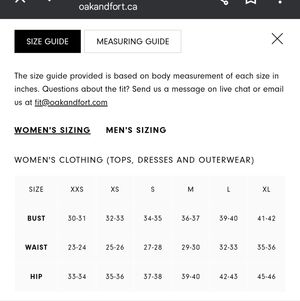 There is no size tag, but dress is an XL (see Oak + Fort's size chart in photos). Approximate flat measurements: