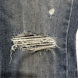 Worn once. Midrise, raw edge hem. Distressed knee. Colour is Medium Wash.