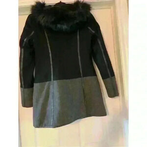 Wool blend coat has fur hood. Coat has zipper as well as buckle closures. Only worn a couple times!