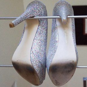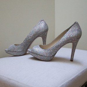 The heel height is about 4" but rise is only like 3" due to platform. Worn a couple of times to special events and matched with sparkly BCBG clutch in another sale listing I have. This is a size 9 but fits me and I'm usually an 8.