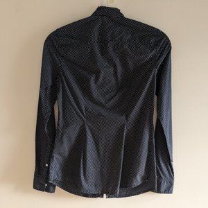 Button-down polka dot shirt with ruched detailing. The fabric has a stretch to it. A cute and feminine take on a collar shirt.