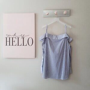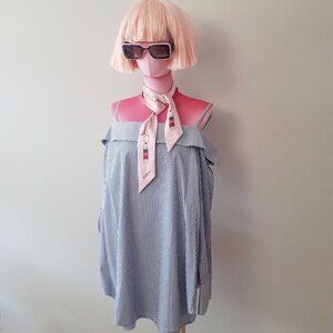 EUC Unknown brand white & blue stripe print cotton blouse with statement neckline