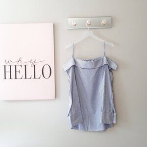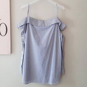 EUC Unknown brand white & blue stripe cotton blouse with statement neckline