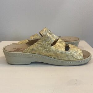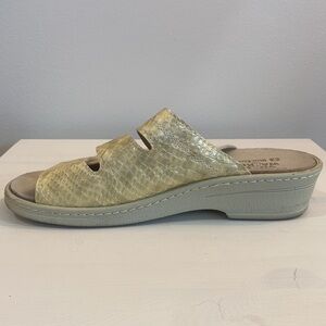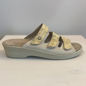 Features three velcro straps on each sandal to adjust fitting and comfort, foot pads are removable ( ideal if you need / want to replace the foot pads without buying a new pair of sandals). A few spots on left shoe, please see pictures for details.