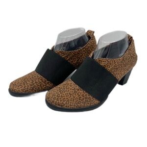 Make each step count with these chic leopard booties. Designed for superior comfort and stability, this pair boasts a sturdy heel, quality leather construction and shock-absorbing sole. The handy pull-tab in the back allows for effortless on-offs, while an elastic strap across the top ensures a perfect fit.