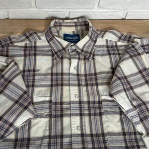 Wrangler Men's Plaid Western Button Down Shirt with Pearlized Snap Buttons in beige, gold, and purple tones.