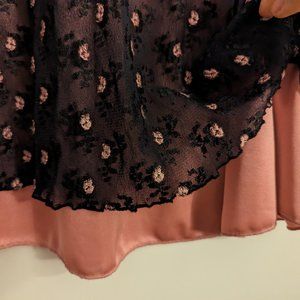 Super cute Y2K dress. The inner-layer color is most accurate in the main pic(cool tone mauve), the camera turns it coral in the close-ups.