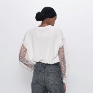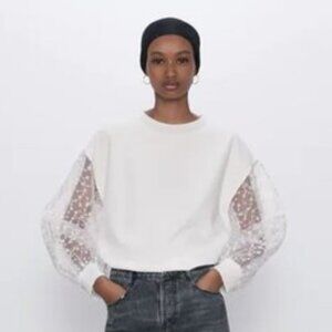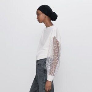 EUC Zara white sweatshirt top with sheer floral print statement sleeves