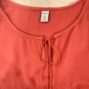 Lightweight coral top with a flattering scoop neckline and tie-front detail. Flutter sleeves add feminine movement. Soft drape for comfortable all-day wear. Easy to pair for casual or dressy looks.