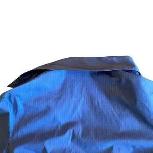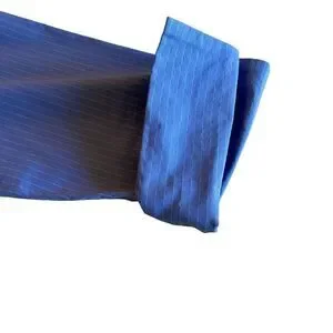 Perfect short for business casual. Really nice blue with slight pinstripe. Ruffle at collar. Wraps at the waist so you can wear it as tight or loose as you like. 3/4 length sleeves. Machine washable.