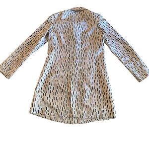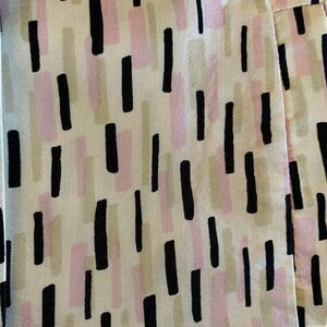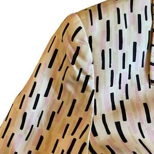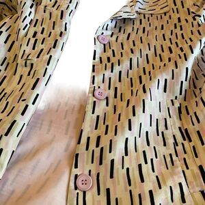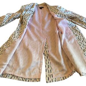 Very pleasant blazer with its white, pink and black pattern. Pink lining. Long so easy to wear with pants or a skirt. In great shape. Ready to wear!