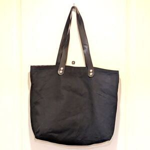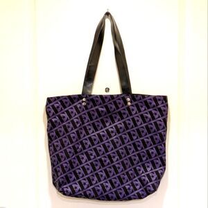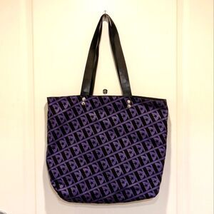 This tote bag is from Elton John's Farewell tour. It features a white Elton John logo on one side, and a purple repeating E on the other, on a black canvas background with faux leather straps and silvertone studs.
