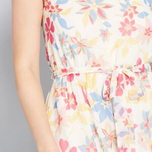 Nothing can rival your glow, but this cream maxi dress from our ModCloth namesake label sure comes close! Enlightening the area with its stunning floral print in pink, blue, yellow, and green hues, this high-neckline gown flaunts a tied back keyhole, a sash topping its elasticized waist for adjustability and comfort, and a silky chiffon material that flows ever-so-spiritedly into a full sweep. What a sight!
