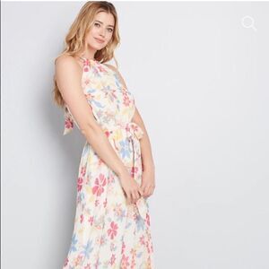 Nothing can rival your glow, but this cream maxi dress from our ModCloth namesake label sure comes close! Enlightening the area with its stunning floral print in pink, blue, yellow, and green hues, this high-neckline gown flaunts a tied back keyhole, a sash topping its elasticized waist for adjustability and comfort, and a silky chiffon material that flows ever-so-spiritedly into a full sweep. What a sight!