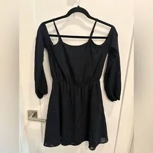 Chic and feminine Ever New dress featuring a flattering off-the-shoulder design with delicate spaghetti straps and flowy long sleeves. This style gives the perfect balance of romantic and modern, with a soft V-neckline, covered button front, and a cinched waist with adjustable drawstring for a flattering fit.