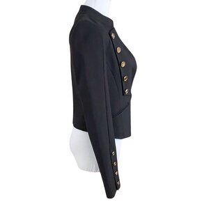 EVER NEW MELBOURNE BLACK MILITARY CROPPED BLAZER JAZ4332, this is a sleek fitted chic and modern black gold buttoned military jacket featuring a faux double breasted design on a single hook & eye front closure - 4 buttons at cuffs on long sleeves - short in length - tailored at waistline - lined - regular shoulder pads - welt front pockets detailing (not usable) - collarless except for a slight mandarin vibe neckline - plunge v on the front for sexy feminine jacket - from work to a fashionnable evening event with heels or high boots - dare the combat boots for a fierce touch.