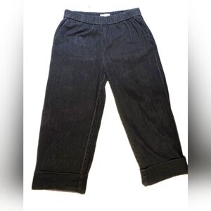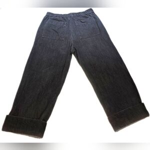Organic cotton black jeans with soft wide elastic waist. Wide leg with optional roll up cuffs. Deep side and back pockets. Slouchy, versatile and comfortable in good condition.