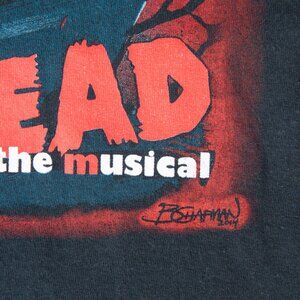 XL Rare Evil Dead The Musical promo t-shirt, 2014 marked on bottom right of graphic on black Gildan t-shirt. In overall good used condition except one small stain that I was unable to remove. Really cool shirt for any Evil Dead fan.