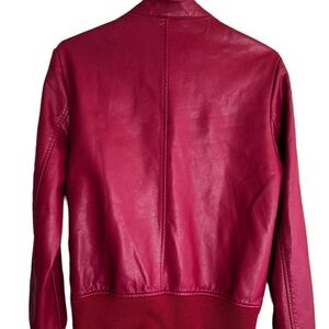 In excellent pre-owned condition, faux leather jacket with front ruffle, gorgeous raspberry colour full front zipper, zippered pockets and sweater hem & cuffs. Size medium see measurements.