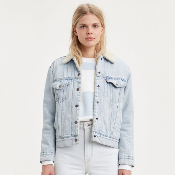 Levi's timeless denim jacket, upgraded with a warm sherpa lining. Features a relaxed silhouette and elongated hem for a casual look.