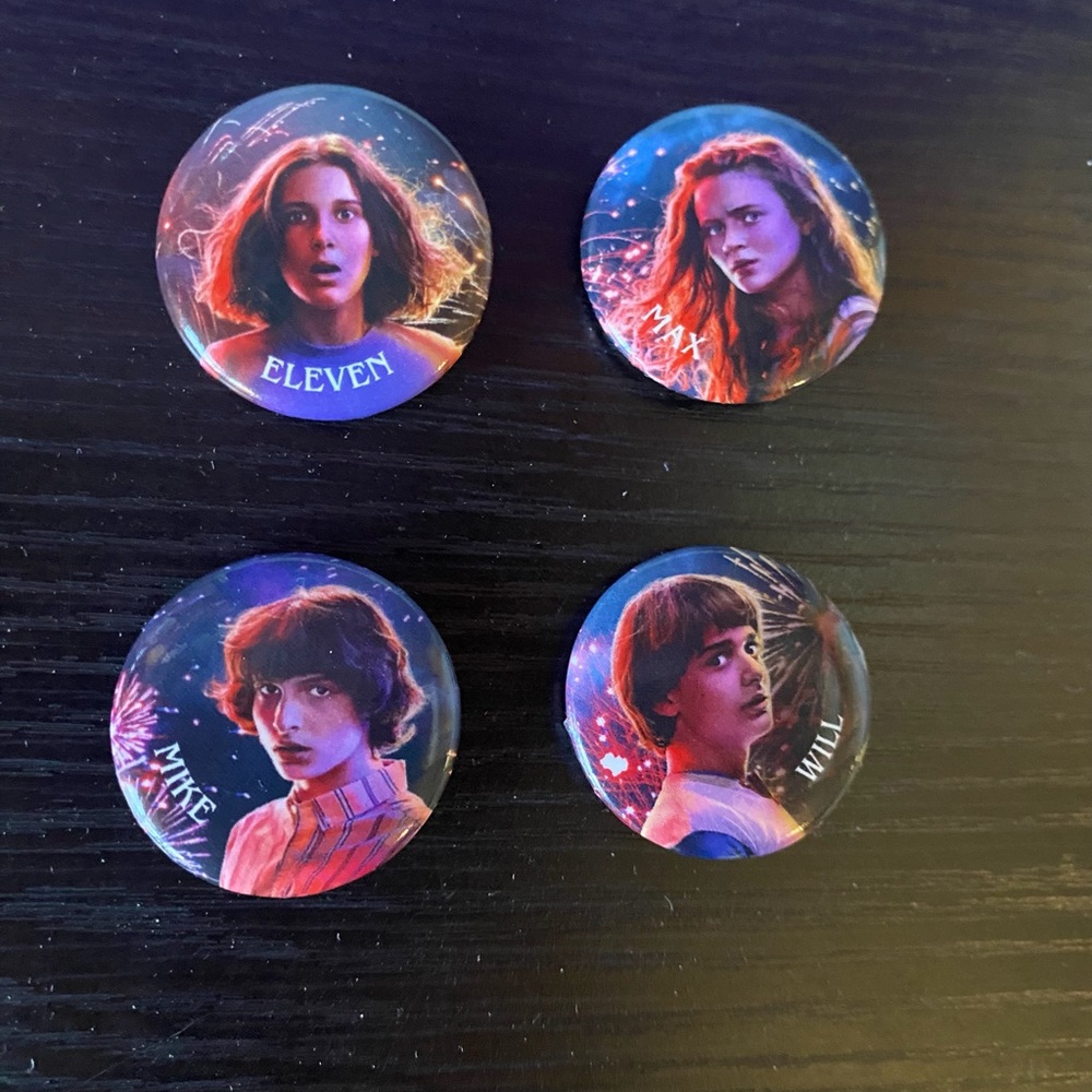 Set of four Stranger Things character buttons featuring Eleven, Max, Mike, and Will, exclusive merchandise from the 2019 themed Calgary Stampede.