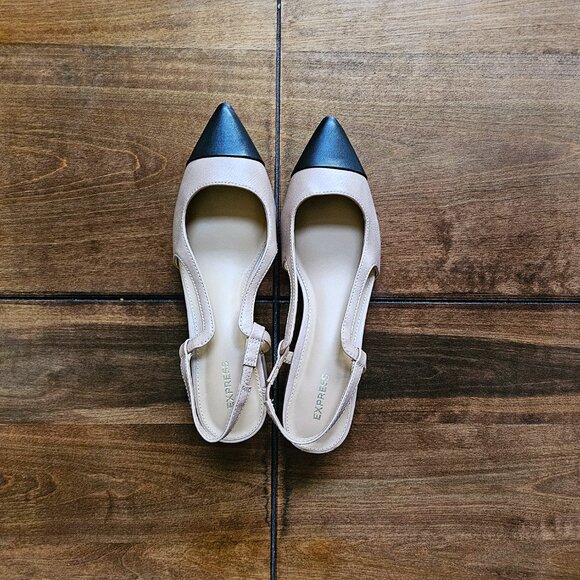 EXPRESS, Classic, elegant tan and black cap toed pointed block heels