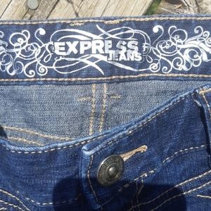 Dark denim shorts by Express Jeans are size 6 and feature 4 pockets, rolled and finished cuff, zip and button fly. Slightly distressed. 16.5" waist lying flat and 2" inseam.