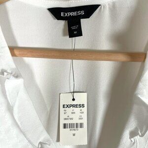 New with tag. EXPRESS V-Neck Popover Blouse MEDIUM White Ruffles Romantic Parisian Style. Please see measurements on size card in photos to help ensure fit. Thanks for looking!