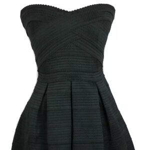 This flattering strapless sweetheart dress by EXPRESS is crafted from thick, stretchy bandage wrap fabric in black. Designed with an A-line silhouette and a fitted bodice featuring a crisscross detail, it enhances your shape with its unique texture and structure. A rubber lining ensures a stay-put fit, making it perfect for semi-formal events like homecoming.