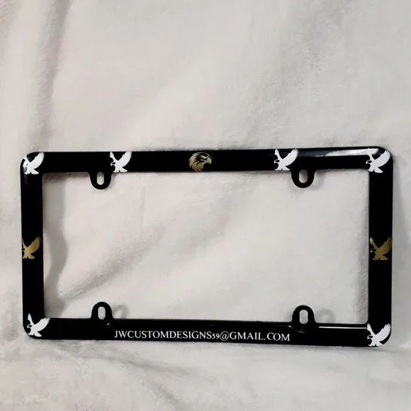 This hand decorated License plate frame adds a unique touch and one of a kind look to any vehicle.