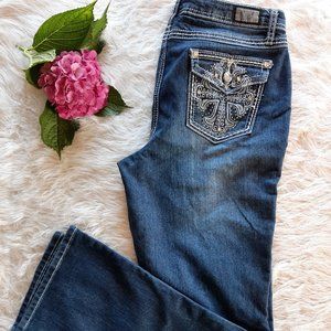 Check out this beautiful Earl Jean blue denim wide leg mid wash in very great pre-loved condition, with rhinestone and Cross embroidery detail on both back pockets.