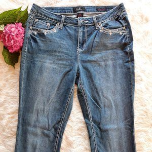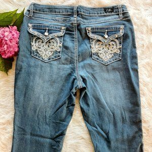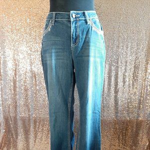 Check out this beautiful Earl Jean blue denim wide leg in very great pre-loved condition, with rhinestone and Boho embroidery detail on both back pockets.