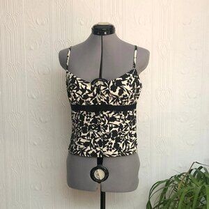 This early 2000 Tara Jarmon top is very retro looking. It was purchased and never worn. It is made of cotton with a ruban and bow under the chest. The staps are ajustable. Please look closely at the measurements to see if it fits: across under the bust 15 inches (bust must be fuller to fit the cups), length taken from the top of the strap 18.5 inches.