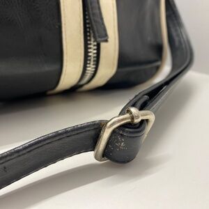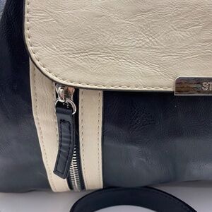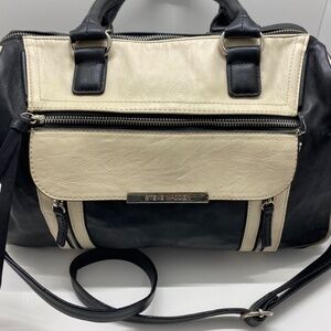 How nostalgic is this incredible bag by Steve Madden?This bag is definitely still usable but there are some flaws to mention; some of the metal strap attachments have accrued some rusting (this can be removed with a CLR type product), the is also a faint stain on the front flap (see photos), and the interior is good but does have a few spots of discolouration.