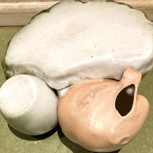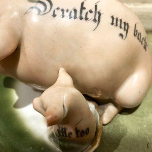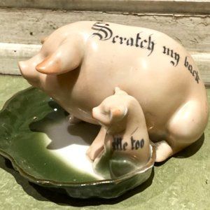 These whimsical ceramic pig figurines were made in Germany in the early 20th century for sale as souvenirs to tourists and visitors to fairs (thus the name "fairing"). The pigs are always pink on green and are engaged in a variety of very human activities. Some were just for fun, while other were often designed to be used as trinket holders, vases or match strikers, like this one (you could also use the tray for pins and the pot fior pencils). They have become very collectible. This fairing is about 3-1/2 inches tall and 5 inches in diameter. It is in very good condition for its age, with no remarkable paint loss and no cracks. However, one of the little piggy's ears has been repaired. (I don't think it changes how cute he is).