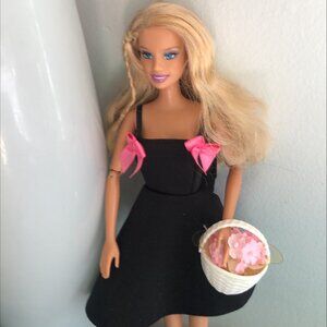 Pretty Barbie doll has jointed arms, and bendable legs. She comes with floral basket, dress, heels, and brush