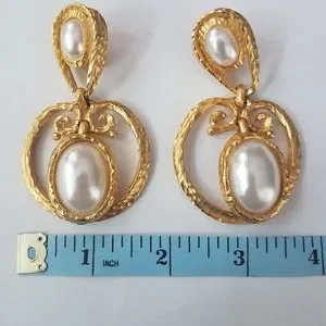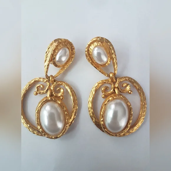 Fab Vintage Clara Studio Inc. Textured Gold Tone with Faux Pearl, Drop Earrings.