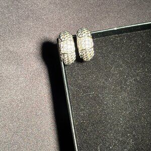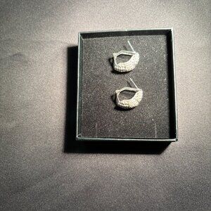 Omega back clasp silver coloured earrings. Silver coloured bead work at the top and bottom with center with 12 clear stones on each earring.