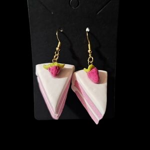 Whimsical strawberry cake earrings. White icing and topped with a glazed strawberry.