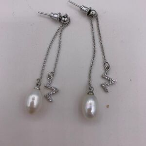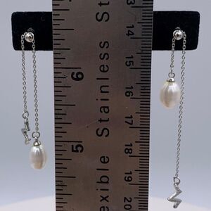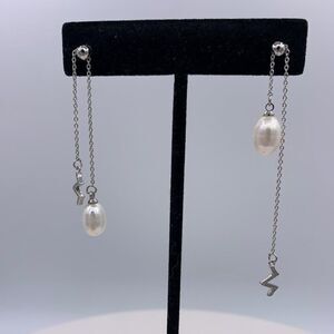 New item without tags. Silver finish chain double drop earring with real freshwater pearls and geometric charm with crystals. Metal unknown, no stamp detected. The chain slides through a hole in the post for an adjustable look. Easy and breezy for beach, resort, day or evening wear. An unusual, edgier look to your classic pearl collection. Add some accompanying pieces from Our Closet (some suggestions shown, all priced and posted separately). Make a bundle to save a bundle at Lemon Squeezy Shop 🍋