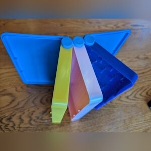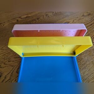 This is a 1980's sturdy multi color plastic case with three compartments for your jewelry. Retro vintage storage.