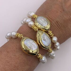 New item, no tags. These real Keshi baroque pearl earrings of statement size, almost 1 full inch, are set in gold plated stud mount. Lovely rainbow hues in the nacre and the free form shape adds drama and impact in this updated classic look, with every pair as unique as you are. Wear with coordinating pieces found in Our Closet (some suggestions shown all priced and listed separately) and really make a statement. Gorgeous with summer linens! Appropriate for upscale day, business or evening wear or wow them at the Country Club. This is how we get Fresh at Lemon Squeezy Shop🍋