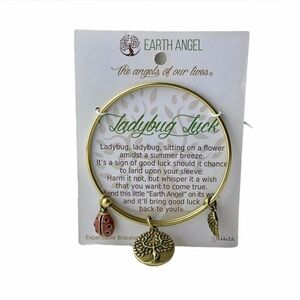 Earth Angel Ladybug Luck Gold Tone Expandable Bracelet is brand new. Gold in colour with an adorable lady bug, a tree pendant and a small wing. Perfect for gift giving or for yourself. Made in Canada!