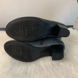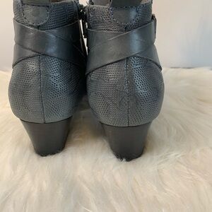 These Earth ankle boots in classic black feature a stylish chunky heel and a decorative buckle detail for a touch of elegance. The rounded toe and ruched ankle design offer a comfortable and relaxed fit, making them perfect for everyday wear. With a sturdy sole, these boots provide both stability and style.