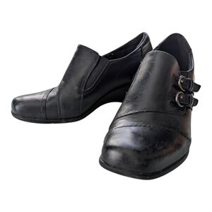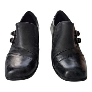 Gelron 2000 memory foam insoles. Easy slip on. Small sturdy heel. Leather upper. Pair of buckles on the side. Decorative stitching.