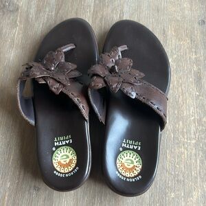 Earth Spirit Flip Flop Dark Brown Sandals with Flower Genuine Leather Size 6