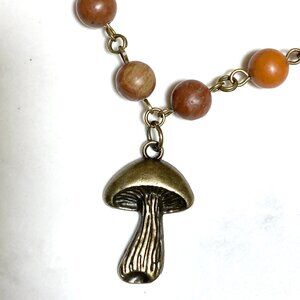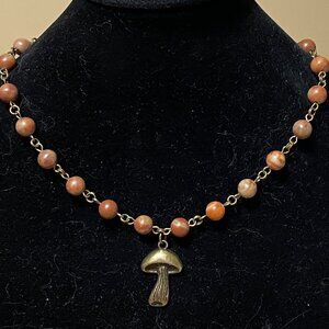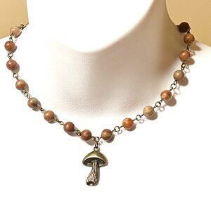 Natural Earthy Polychrome Jasper Necklace, Bronze Slim Mushroom + Genuine Gemstone