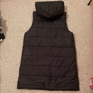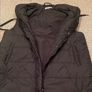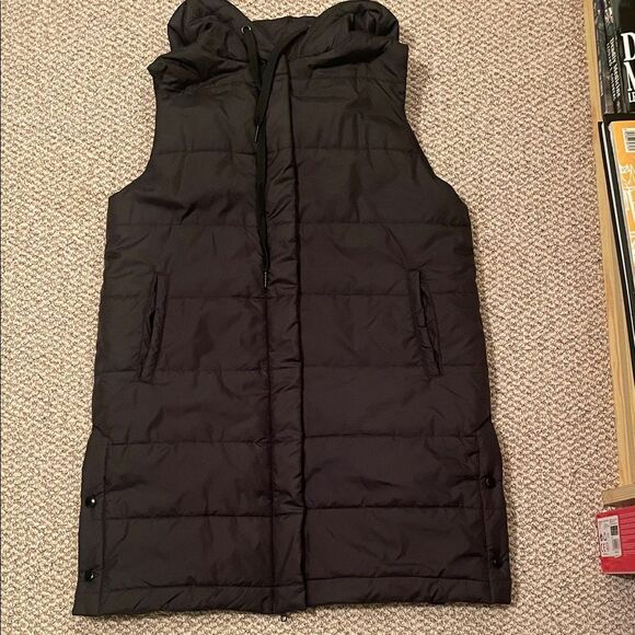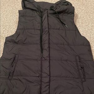 Chic charcoal vest with a cozy hood. Features convenient front pockets. Ideal for layering.